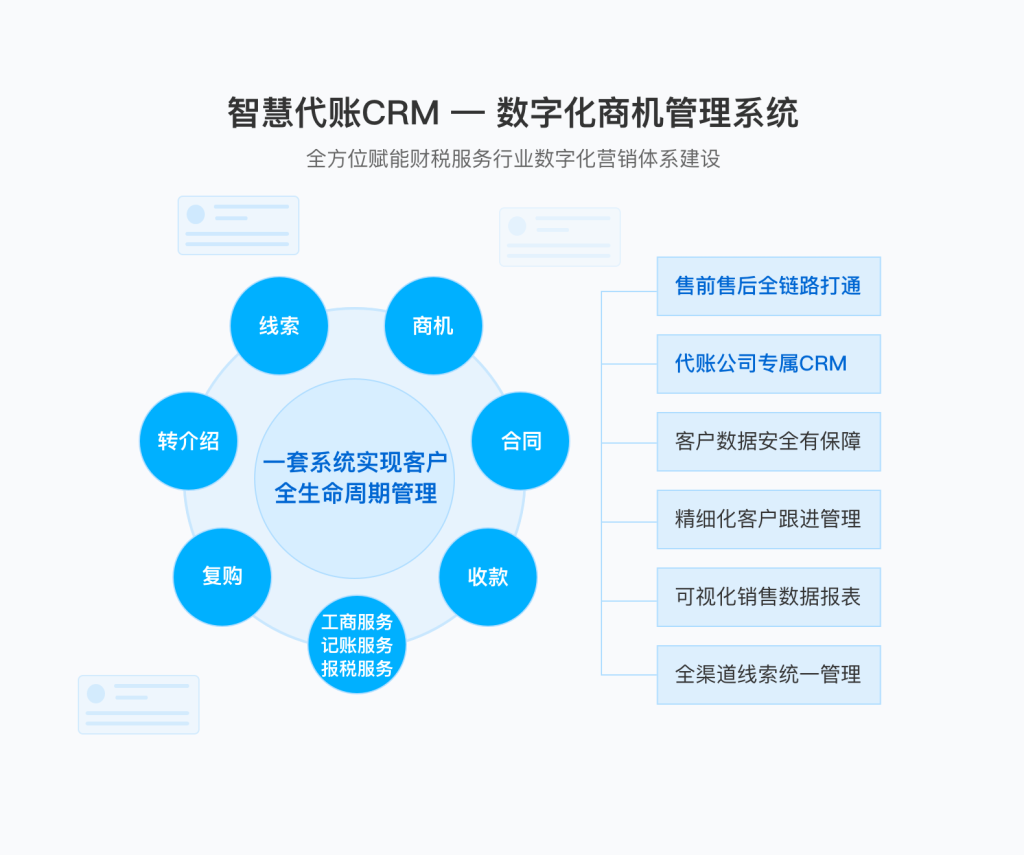多套系统烦商机、工商、财税系统相互孤立,售前售后难以统一管理?“转介绍”进度不透明,成功率不高?